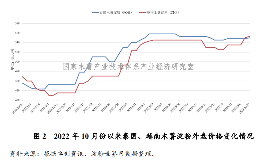 从外盘木薯淀粉市场行情来看,随着鲜木薯上市量持续增加,泰国淀粉工厂原料供应状况持续向好,淀粉产量呈现出小幅回升态势,成品库存量略有提高;越南鲜薯原料供应情况持续改善,木薯淀粉产量有所增加。受近期中国市场需求趋缓等因素影响,泰国和越南木薯淀粉出口行情总体呈稳中略跌的态势。本周泰国和越南木薯淀粉市场价格小幅回升。其中,泰国木薯淀粉报价区间为FOB(曼谷)540~560美元/吨(约合人民币3950~4097元/吨),较上周小幅回升2美元/吨;越南木薯淀粉报价区间为CNF545~560美元/吨(约合人民币3987~4097元/吨),较上周小幅回升3美元/吨(见图2)。