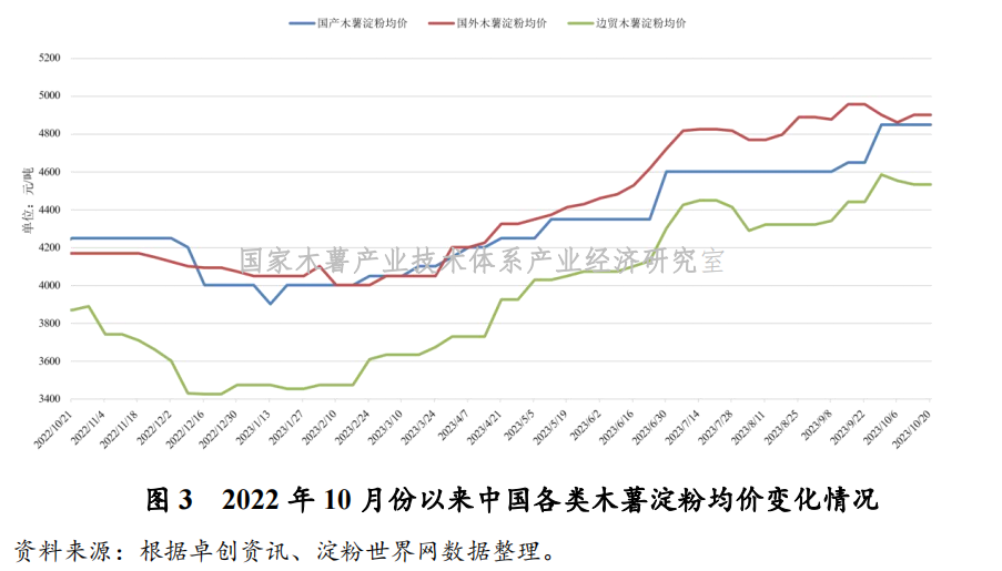 从国内木薯淀粉市场行情来看,本周国内木薯淀粉价格总体稳定。尽管外盘木薯淀粉价格稳中上涨,但受国内木薯淀粉市场销售缓慢等因素影响,本周国内木薯淀粉价格总体稳定。其中,泰国中高端木薯淀粉含税报价为4650~4950元/吨;越南主流木薯淀粉含税报价为4580~4850元/吨。由于广西边贸市场过关淀粉维持低位,当前主流木薯淀粉报价为4470~4600元/吨;国产淀粉厂家没有库存积压,主流木薯淀粉报价为4850~4950元/吨(见图3)。