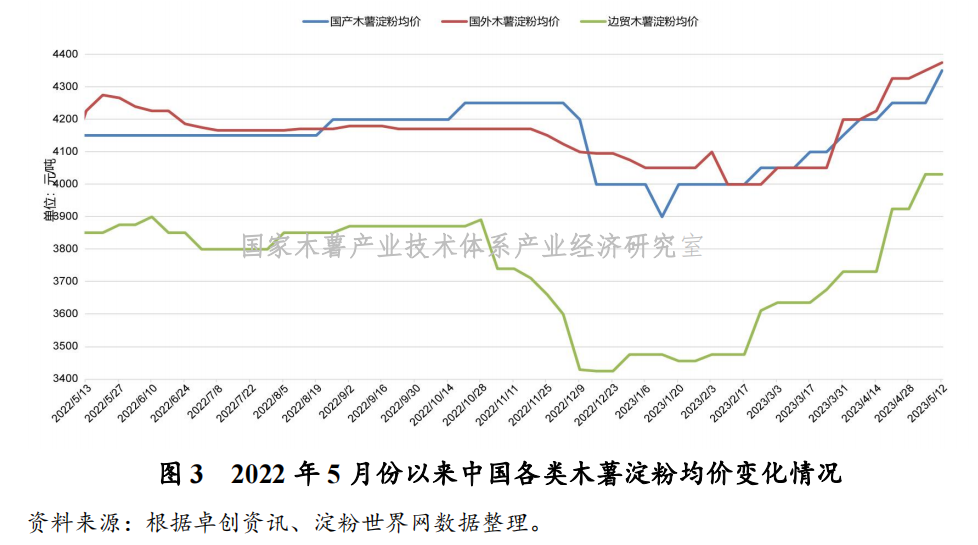 从国内木薯淀粉市场行情来看,外盘报价持续推高,进口成本居高不下,木薯淀粉现货价格继续跟涨,但受下游需求减少影响,涨势放缓。本周国内木薯淀粉市场整体价格较上周略有增长,其中,泰国中高端木薯淀粉含税报价为4200~4500元/吨,较上周小幅上涨50元/吨;越南主流木薯淀粉含税报价为4120~4250元/吨,较上周小幅上涨50元/吨;边贸淀粉市场中,广西边贸市场到货较少,当前主流木薯淀粉报价为3980~4080元/吨,国产淀粉厂家库存无压,主流木薯淀粉报价为4350~4450元/吨,较上周上涨100元/吨(见图3)。