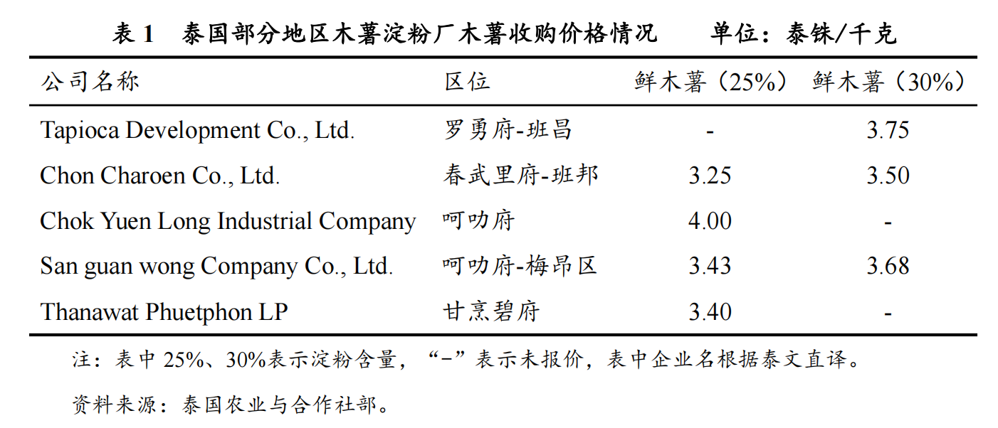 泰国农业与合作社部的数据显示,本周泰国国内鲜薯平均收购价格为3.03泰铢/千克(约合人民币617元/吨),较上周小幅回落0.09泰铢/千克。该部门监测的几家淀粉厂的鲜薯收购价为3.25~4.00泰铢/千克(见表1,约合人民币661~814元/吨),其中,呵叻府-梅昂区的鲜薯收购价小幅回落。
